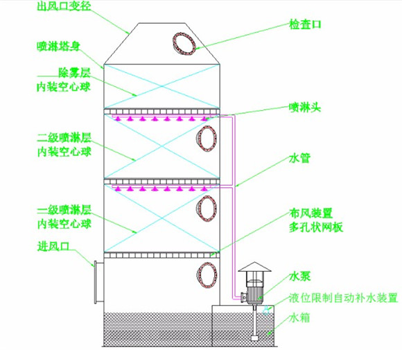 噴淋塔可以由鐵、不銹鋼、PP等等材料制作而成,當(dāng)粉塵進(jìn)入噴淋塔,噴淋塔裝置向下噴水,水與粉塵結(jié)合,沉淀到污水池里,最后達(dá)標(biāo)排放,達(dá)到凈化的目的
