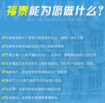 18年已經積累了8000多家客戶和不同的實體行業(yè)改善了車間高溫悶熱異味環(huán)境,客戶轉介紹的也是很大一部來信賴和支持福泰的工作,既然客戶那么信任我們有何理由不站在客戶的角度為他們解決他們當前的困擾呢!如果您的工廠也存在這樣的車間問題可以咨詢官網客服溝通我們竭誠與你服務!