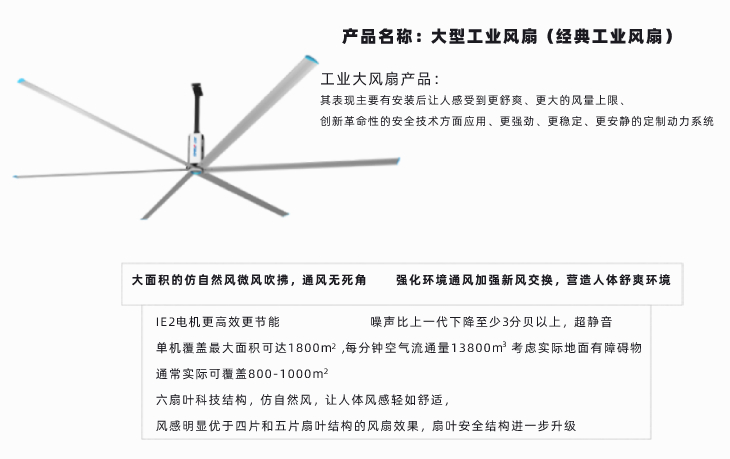1、風量大覆蓋廣:每分鐘空氣流通量15000m3,單機最大覆蓋面積可達2000平方米; 2、極小的投資良好的效果,超高性價比:廠房面積過大,安裝空調成本太高,一般通風設備沒有用武之地而大風扇能以小投資,達到良好的綜合效果; 3、取代空調:可使人體感受約5-7℃的溫差效應,部分場所可與傳統(tǒng)空調輪值使用,從而一定程度上達到取代中央空調的效果; 4、高效節(jié)能:配置永磁直驅電機效率進一步提高,更節(jié)能,每小時實際耗電0.8-1.2千瓦; 5、免維護壽命長,專業(yè)無憂服務:創(chuàng)新技術,低轉速、磨損少,免維護,壽命長;18年行業(yè)前沿服務經驗,擁有大量應用案例,為用戶提供獨到的高價值一站式解決方案; 6、品質穩(wěn)定:高端配置,品質穩(wěn)定性極高,性能卓著。